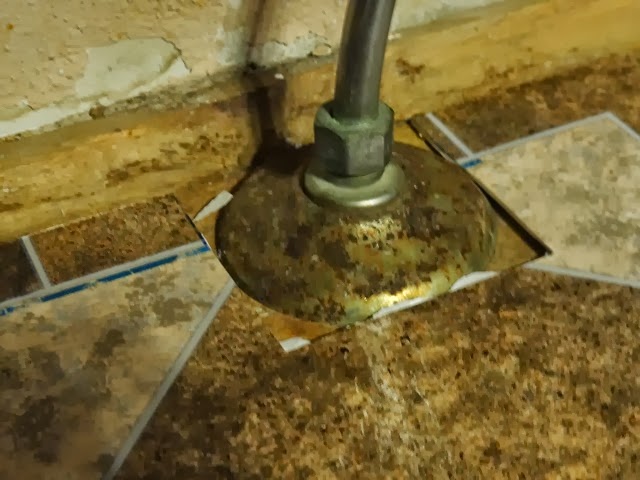Carefully cut out your spaces. Now do a dry fit. Cuss again, Start over. You probably will get it someday. Each time you make a mistake you'll see what you did wrong and try to correct it the next time. I chose square cuts to go around and tube shape. If you really like cussing, go ahead and cut it out in a circle. I figured I would never see it once everything was put back inside, so I opted for the easier solution. This may be a good time to bring up centering your tiles in the space. If you want it to look professional, you know cuz professionals use peel and stick tiles, you'll want to find your front center point and lay the tiles out beginning on that line. I didn't care, because once again, I'll never see it after everything is back in and the doors are closed.